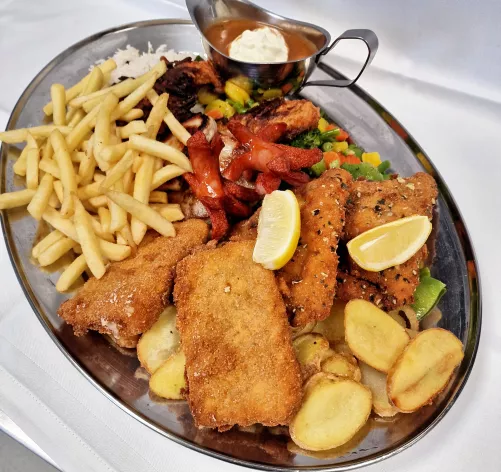 Sterisches Cordon Bleu, Putenmedaillons in der Kartoffelkruste, gebackenen Bergkäse, Schweinesteak gegrillt,